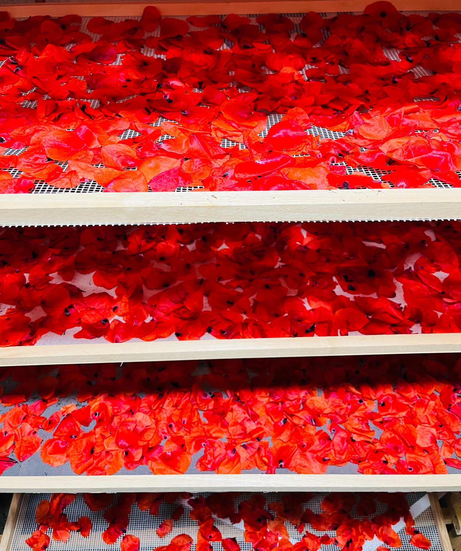 Pour le séchage, nous privilégions la tradition et la nature : les fleurs sont délicatement disposées sur des claies en bois, sans recours à des procédés artificiels comme le gaz ou les fours. Un processus lent et naturel qui sublime chaque thé aux fleurs et respecte l’intégrité des plantes.