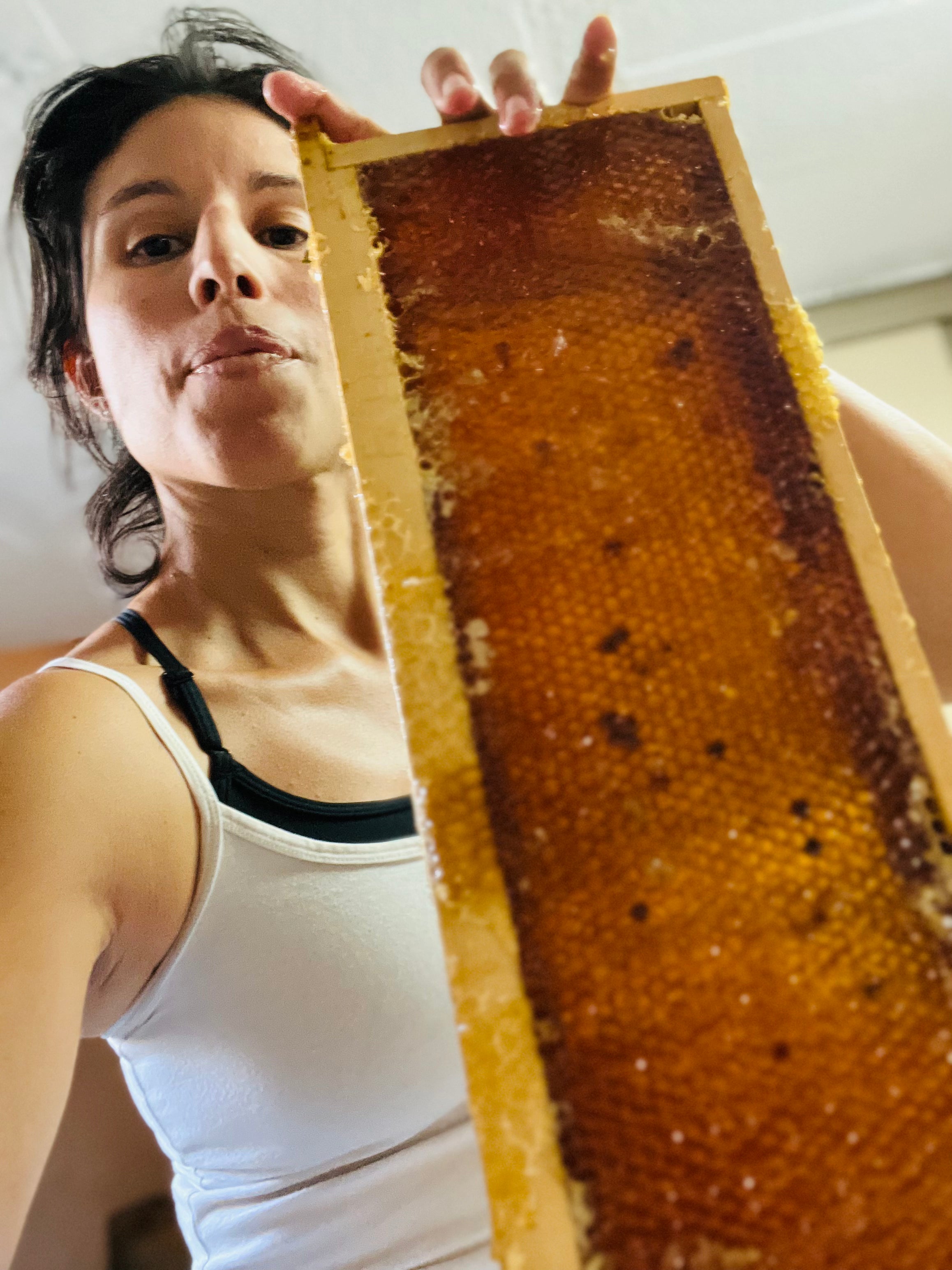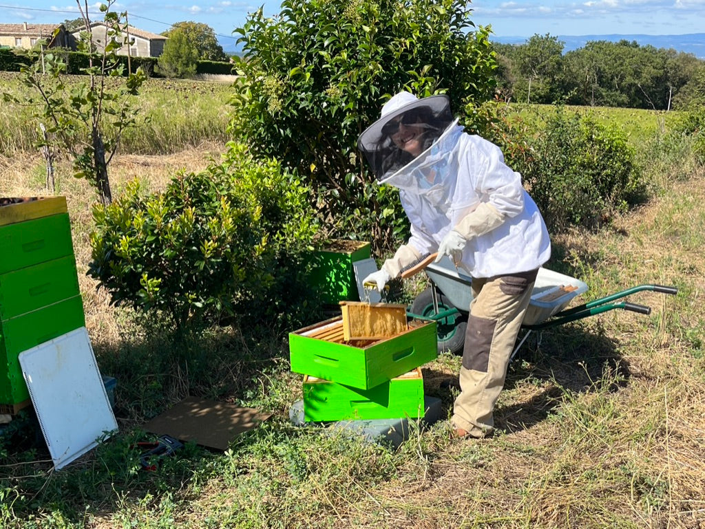 Nous récoltons les cadres remplis de miel pour l'extraire dans une centrifugeuse.