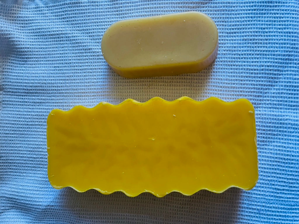 Nous récoltons et purifions la cire pour la préparation de baumes. En bas notre cire et en haut une cire du commerce.
