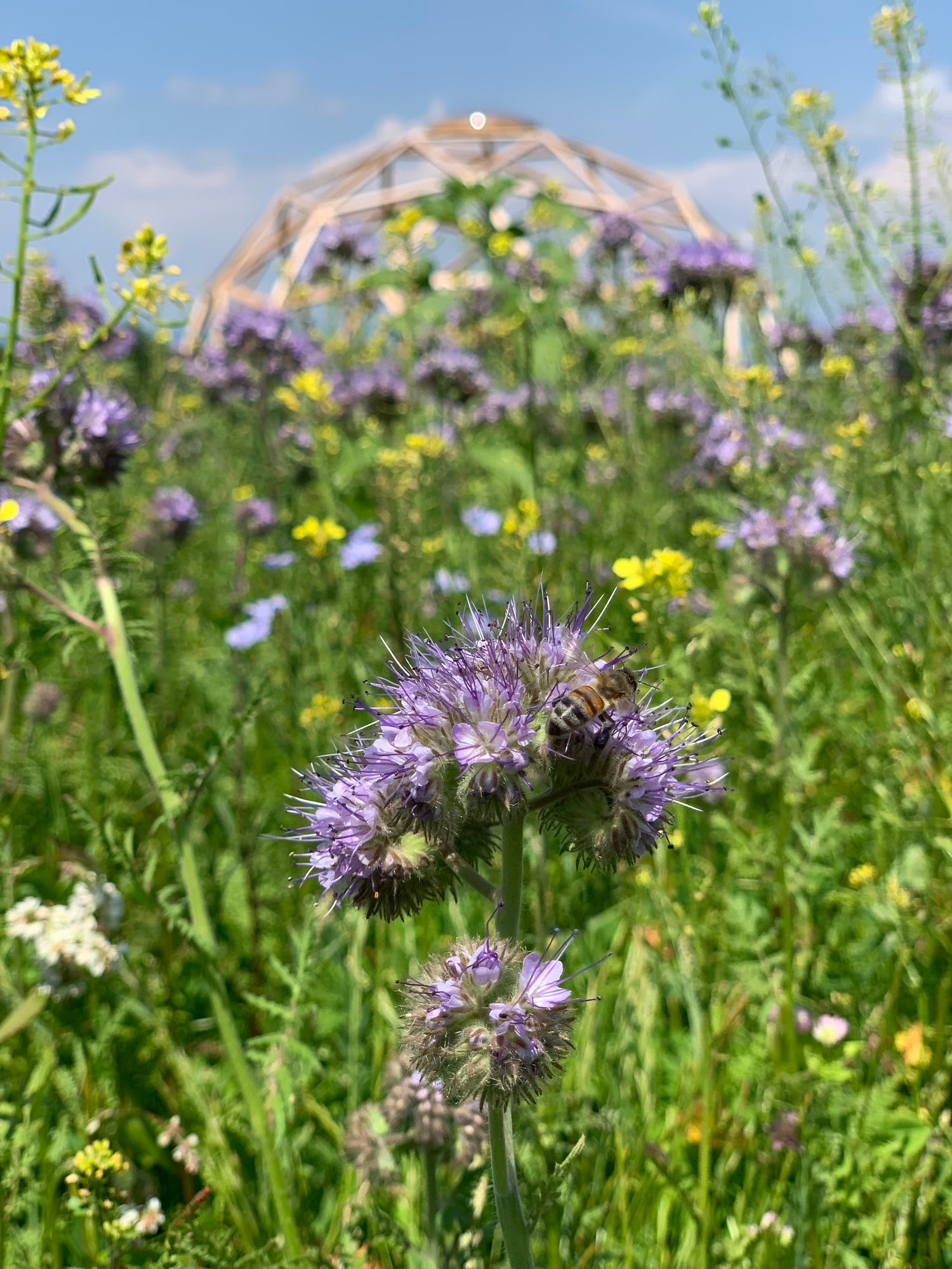 Nous avons planifié et conçu la ferme pour que les cultures soient interconnectées entre elles. Ainsi, la prairie mellifère ainsi que les haies nous fournissent du paillage pour protéger les cultures du soleil et du manque d'eau. Ce paillage permet aussi de diminuier la concurrence d'autres herbes et donc moins de corvée de désherbage !